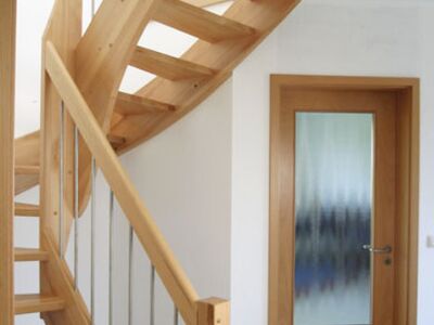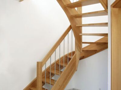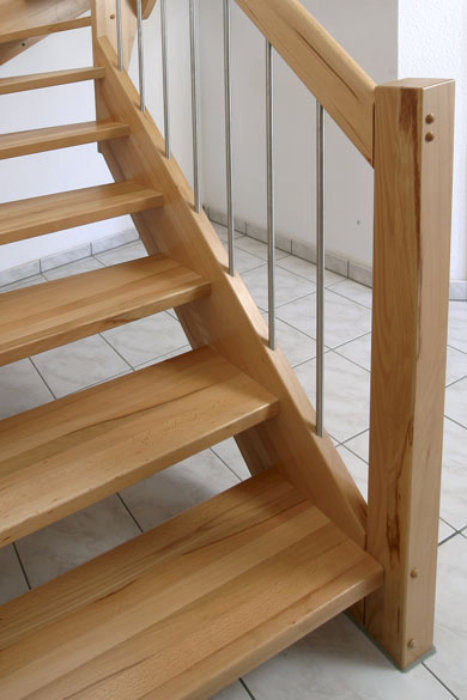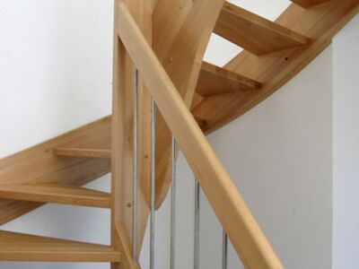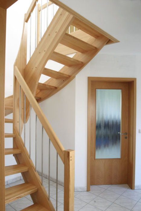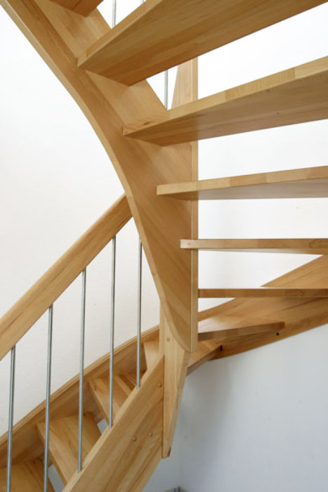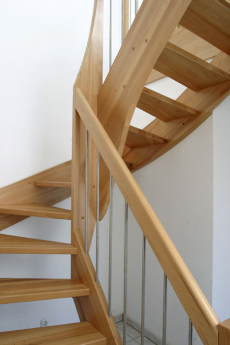 Beidseitig eingestemmte Treppe, 1/2 gewendelt, Holzart: Buche natur, Edelstahl Geländerstab