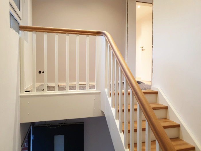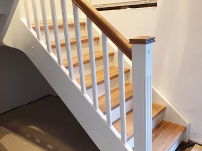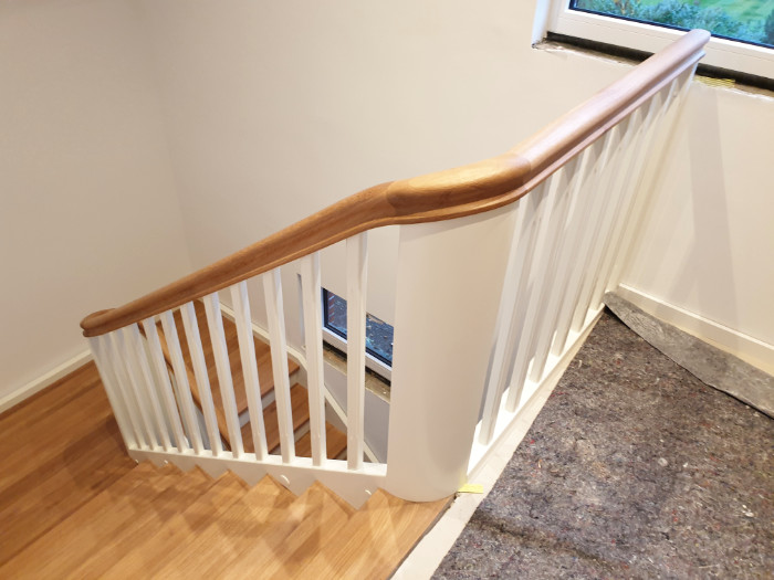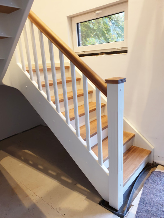 Beidseitig eingestemmte Podesttreppe, 1/2 gewendelt, Holzart: Eiche-weiß, Setzstufen, Krümmlinge