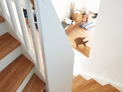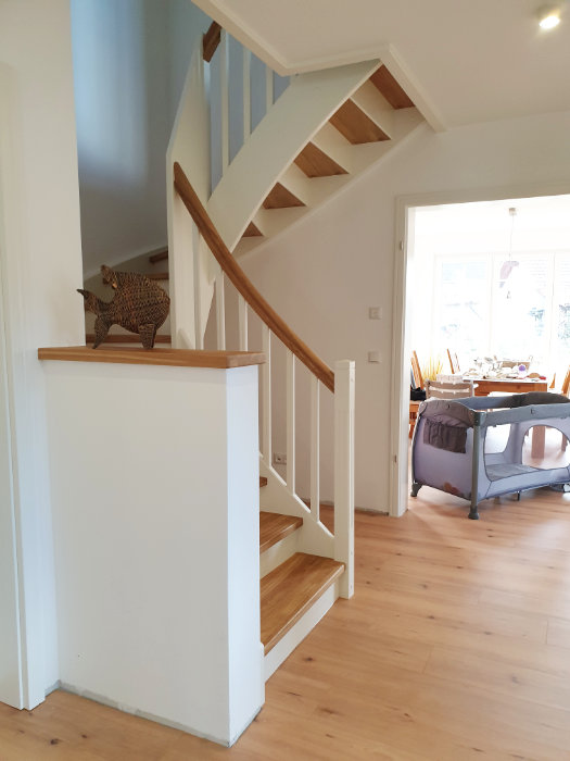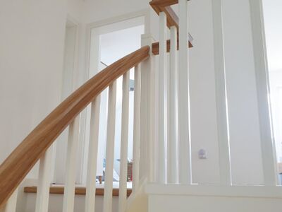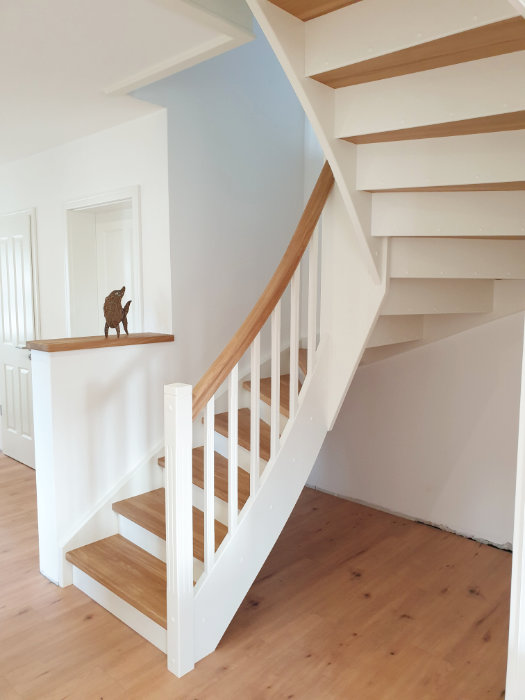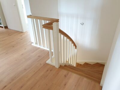 Beidseitig eingestemmte Treppe, 1/2 gewendelt, Holzart: Eiche-weiß, Setzstufen, stehende Wange in Wendung