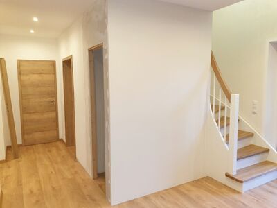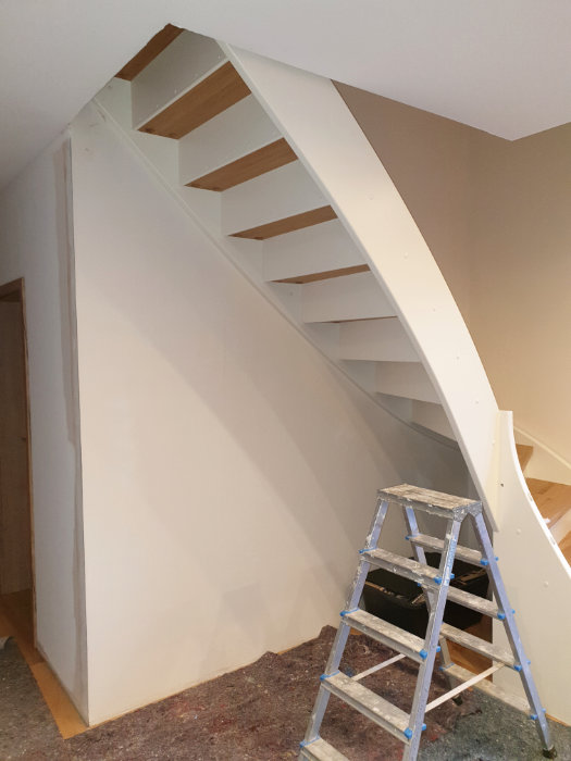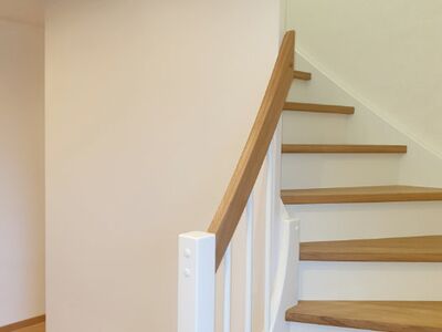 Beidseitig eingestemmte Treppe, 1/4 gewendelt, Holzart: Eiche-weiß, Setzstufen, beschichtete Wandplatte
