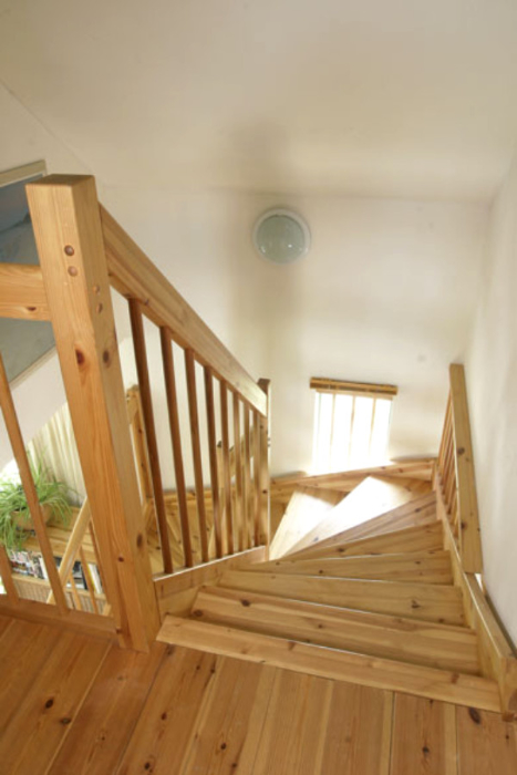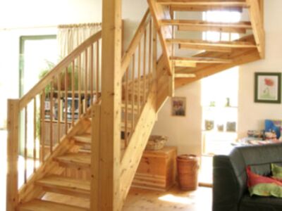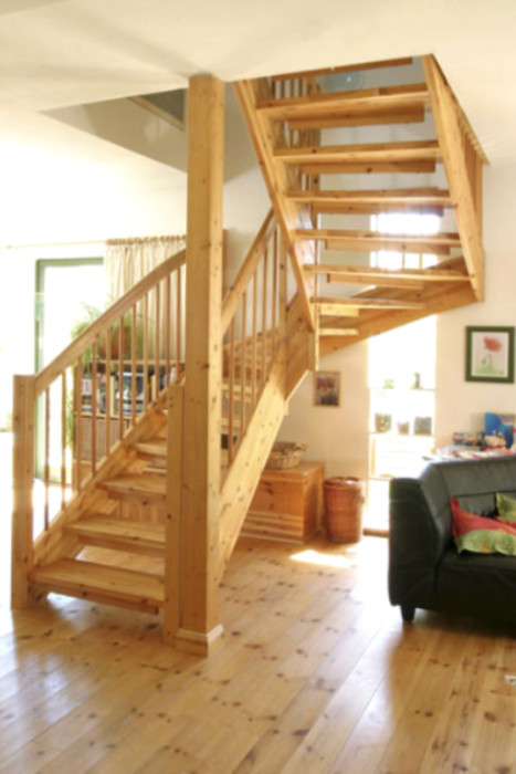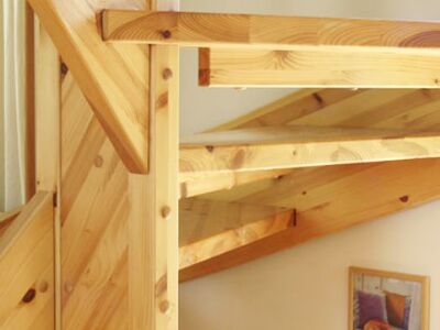 Beidseitig eingestemmte Treppe, 1/2 gewendelt, Holzart: Kiefer natur, Geländer an Freiseite