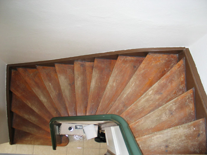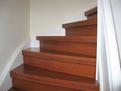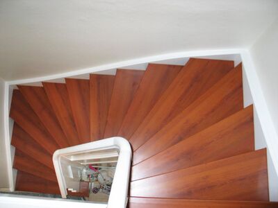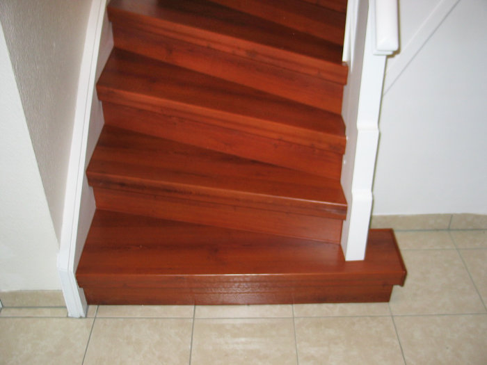 Stufen und Setzstufen Laminat Kirsche, Rest weiß lackiert, Boden Flur oben im Dekor