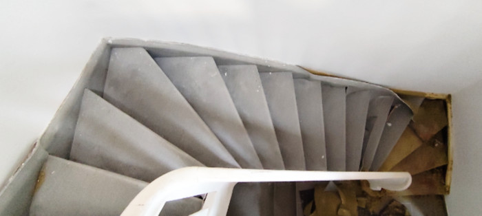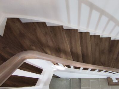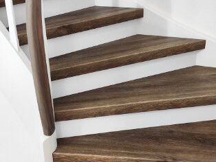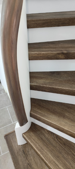 Stufen Vinyl Bergeiche, Setzstufen weiß, Handlauf stufenfarben lackiert, Rest weiß lackiert