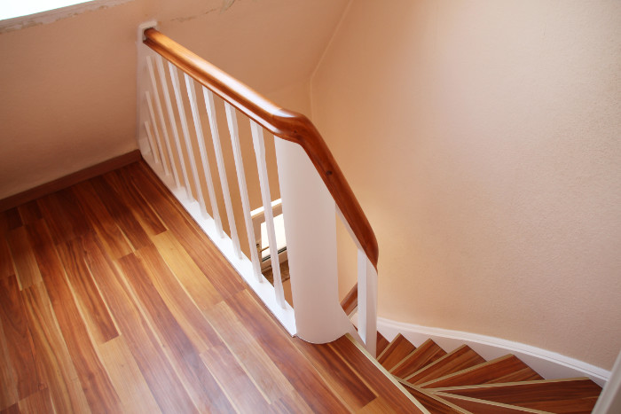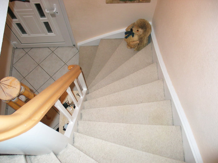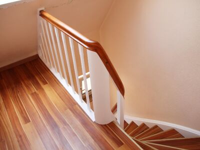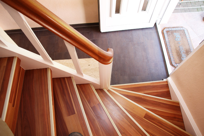 Stufen und Setzstufen Laminat Zwetschge, Handlauf stufenfarben, Rest weiß lackiert, Boden Flur oben im Dekor