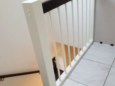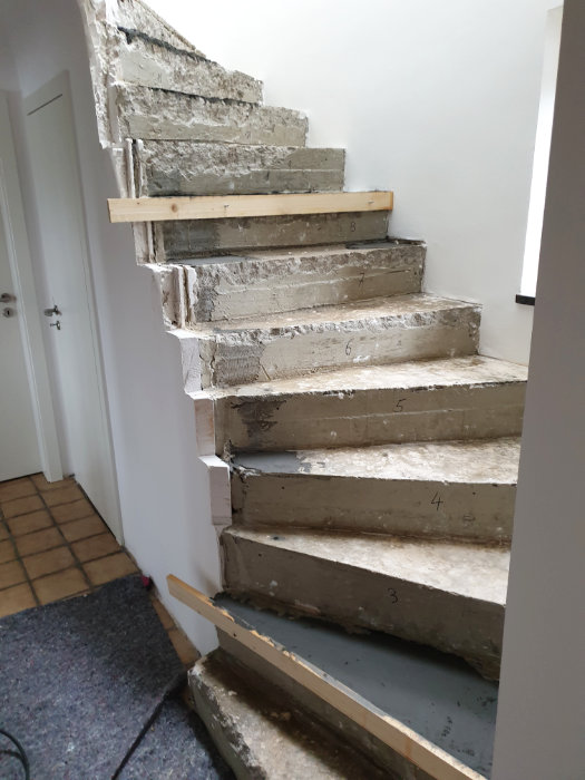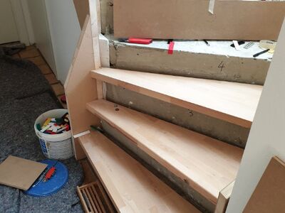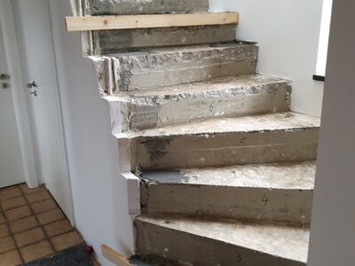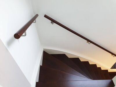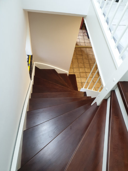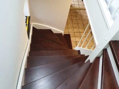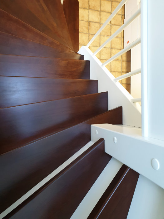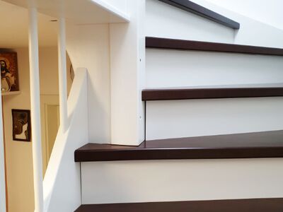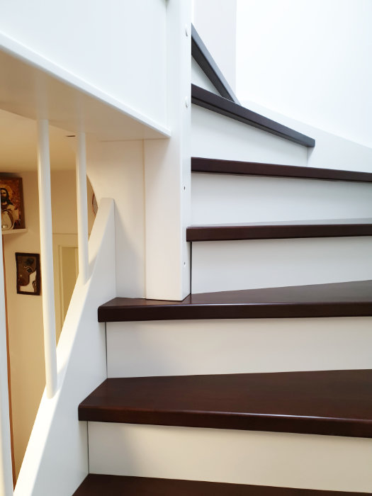 Betontreppe verkleidet mit Holzstufen in Buche dunkel gebeizt, Treppengeländer und Wangen in Holz weiß lackiert, Wandhandlauf
