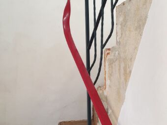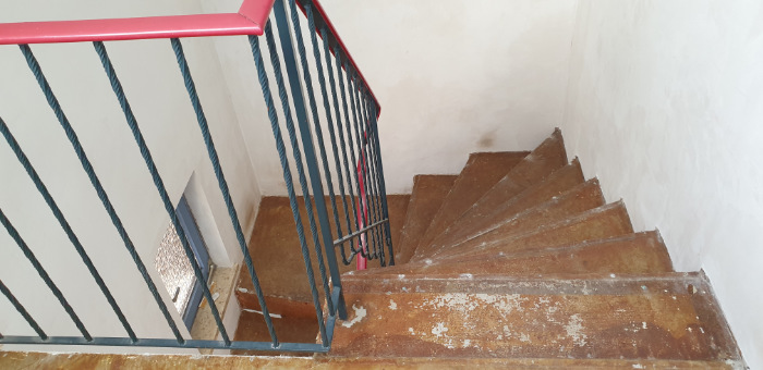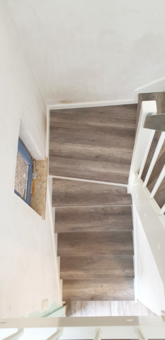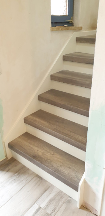 Betontreppe verkleidet mit Laminatstufen Eiche Vintage Grau, Treppengeländer und Wangen in Holz weiß lackiert