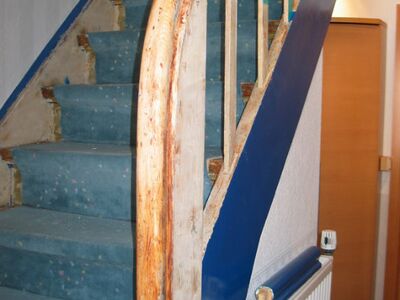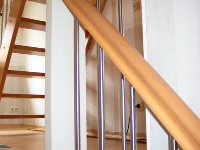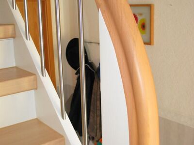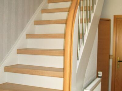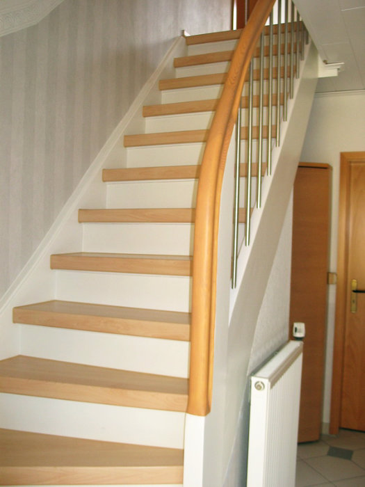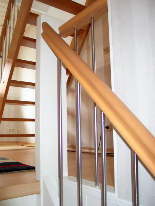 Stufen Laminat Buche, Setzstufen weiß, Handlauf natur, neue Geländerstäbe Edelstahl