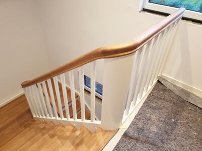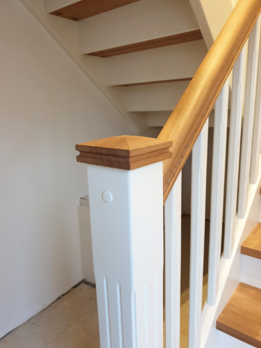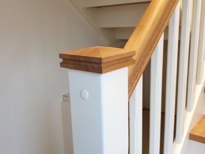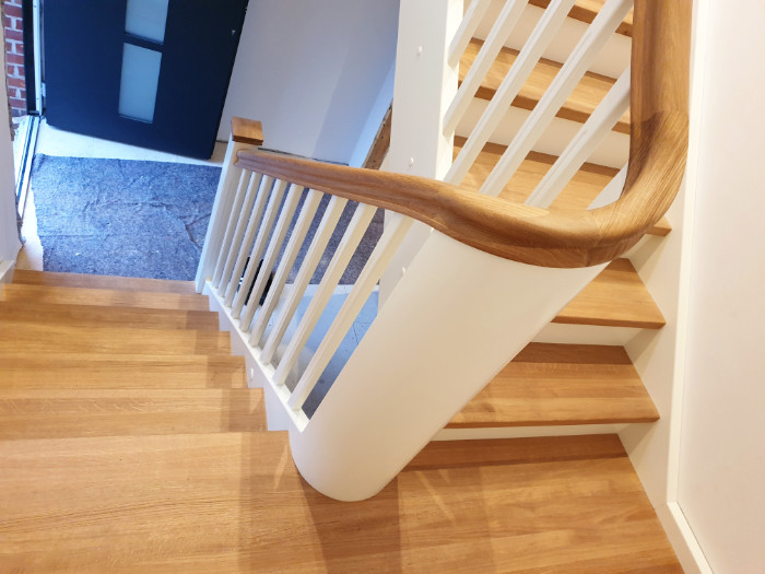 Beidseitig eingestemmte Podesttreppe, 1/2 gewendelt, Holzart: Eiche-weiß, Setzstufen, Krümmlinge
