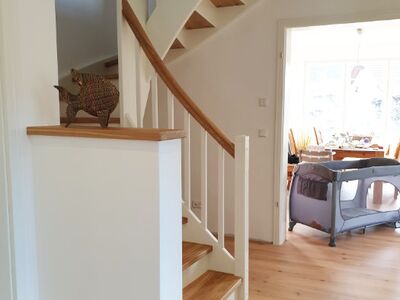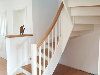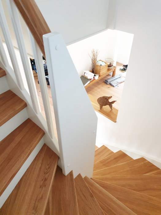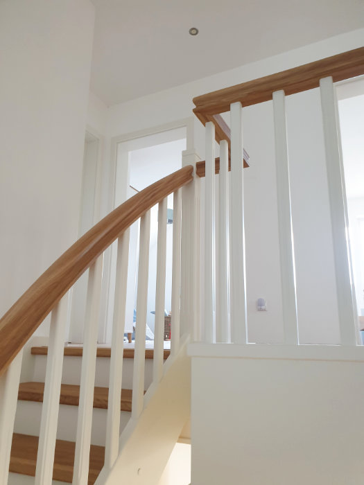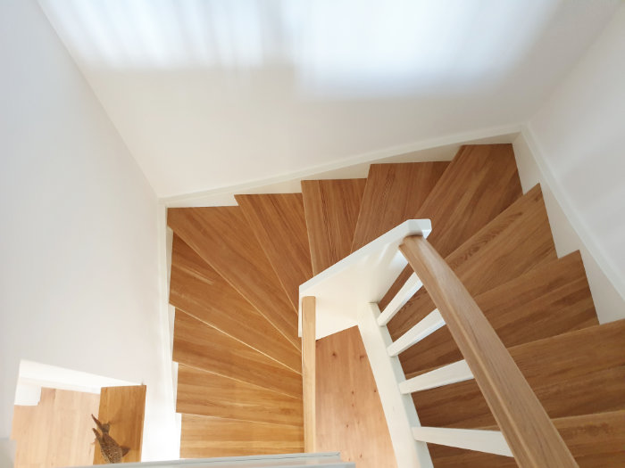 Beidseitig eingestemmte Treppe, 1/2 gewendelt, Holzart: Eiche-weiß, Setzstufen, stehende Wange in Wendung