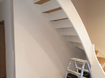 Beidseitig eingestemmte Treppe, 1/4 gewendelt, Holzart: Eiche-weiß, Setzstufen, beschichtete Wandplatte