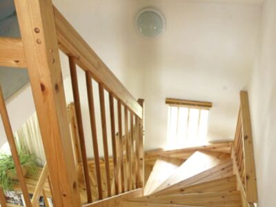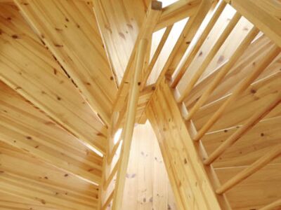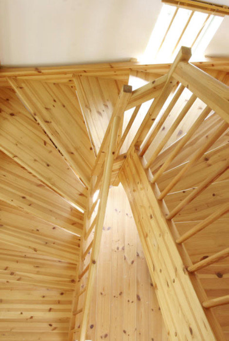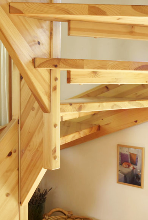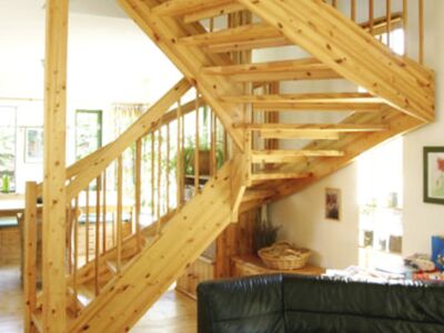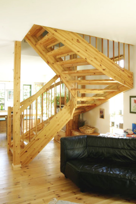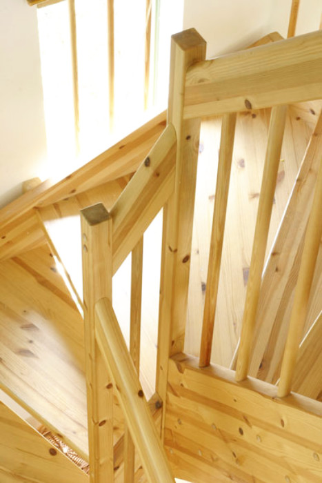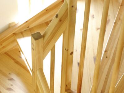 Beidseitig eingestemmte Treppe, 1/2 gewendelt, Holzart: Kiefer natur, Geländer an Freiseite