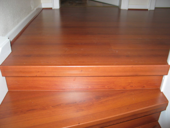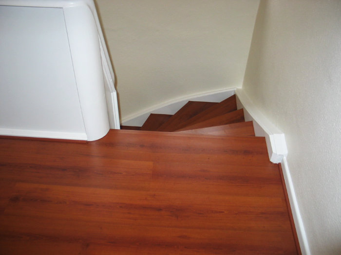 Stufen und Setzstufen Laminat Kirsche, Rest weiß lackiert, Boden Flur oben im Dekor