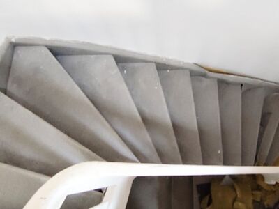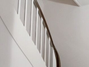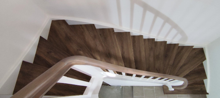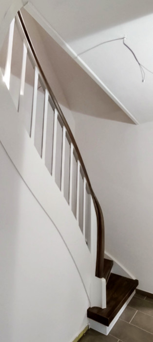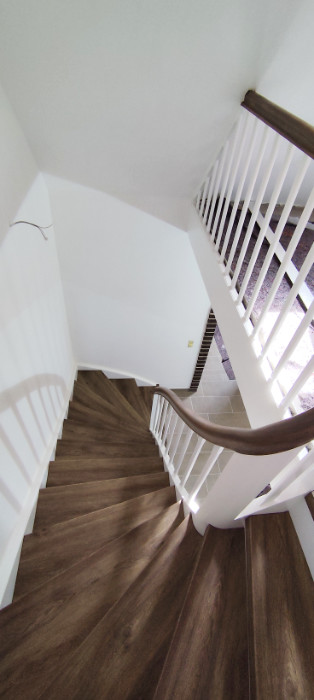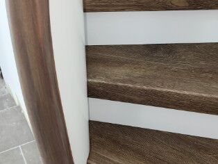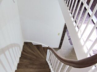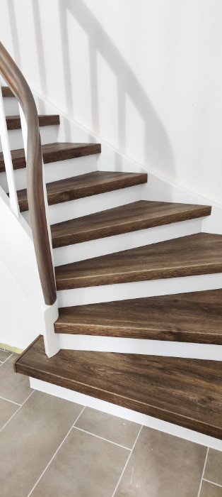 Stufen Vinyl Bergeiche, Setzstufen weiß, Handlauf stufenfarben lackiert, Rest weiß lackiert