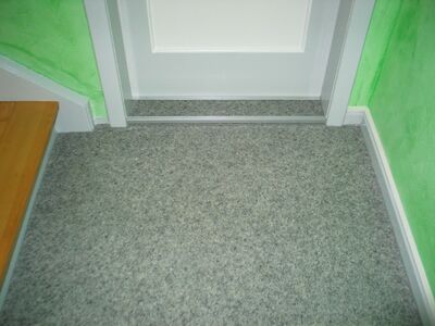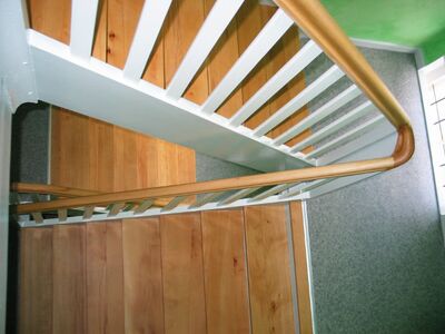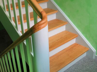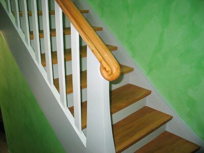 Stufen und Handlauf Buche natur, Podeste Vinyl, Rest weiß lackiert