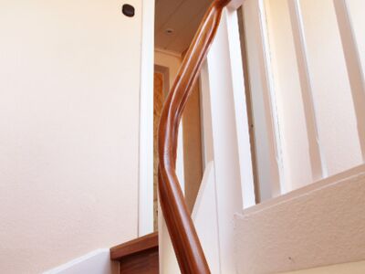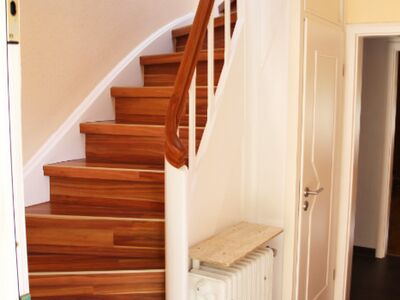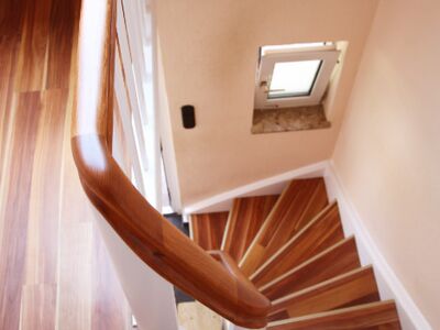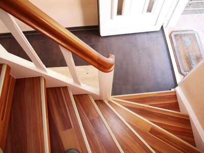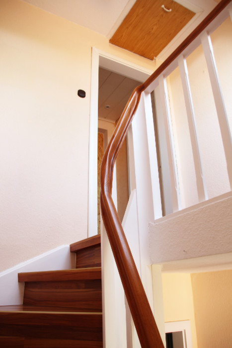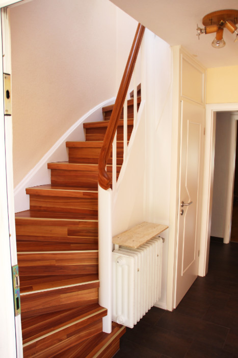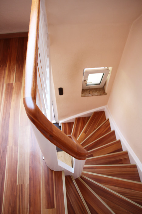 Stufen und Setzstufen Laminat Zwetschge, Handlauf stufenfarben, Rest weiß lackiert, Boden Flur oben im Dekor
