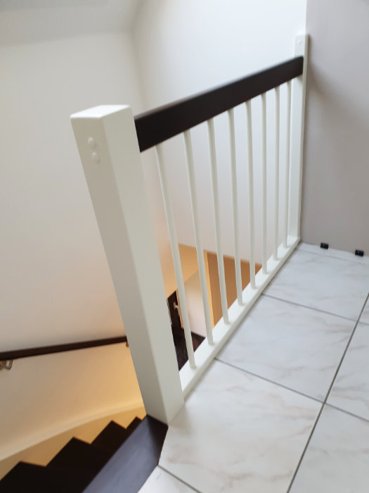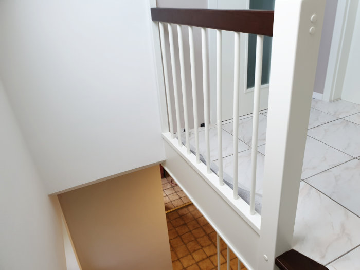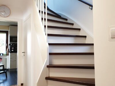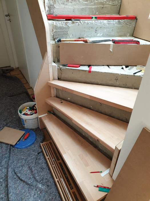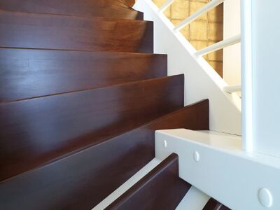Betontreppe verkleidet mit Holzstufen in Buche dunkel gebeizt, Treppengeländer und Wangen in Holz weiß lackiert, Wandhandlauf
