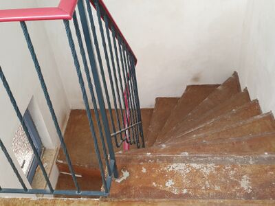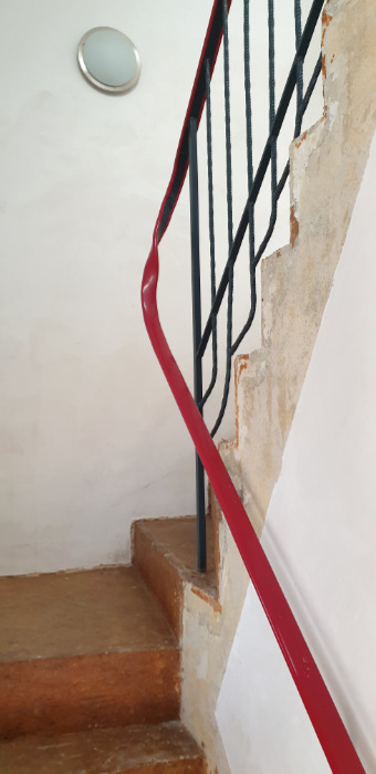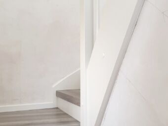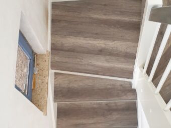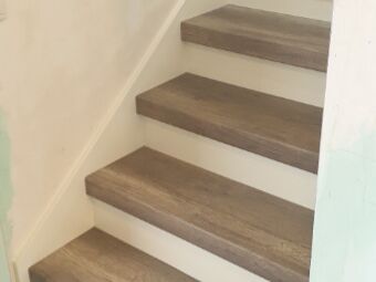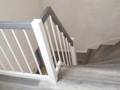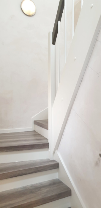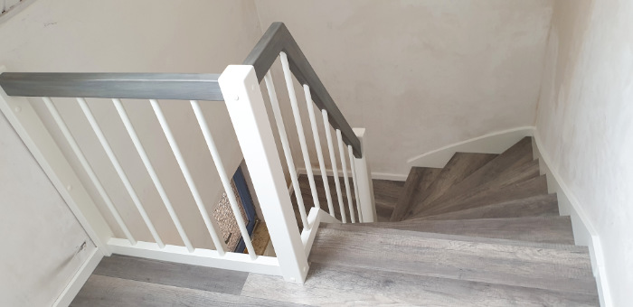 Betontreppe verkleidet mit Laminatstufen Eiche Vintage Grau, Treppengeländer und Wangen in Holz weiß lackiert