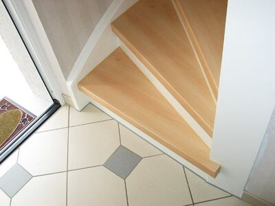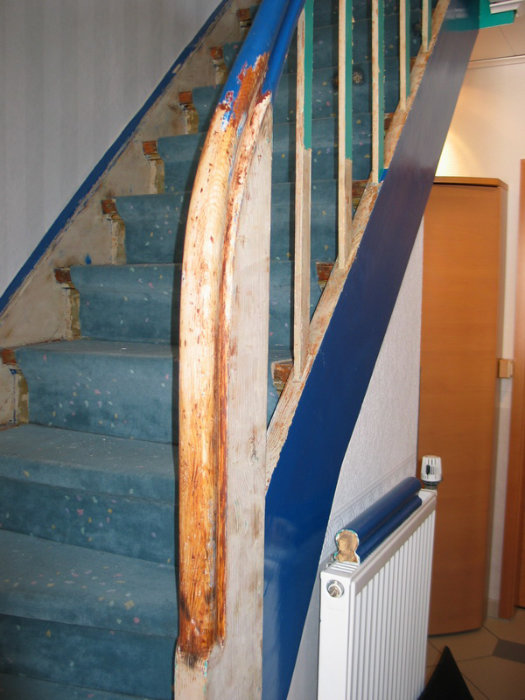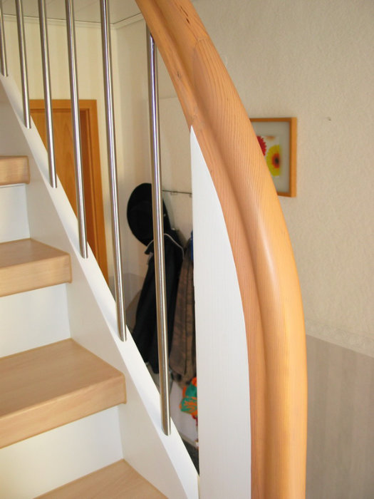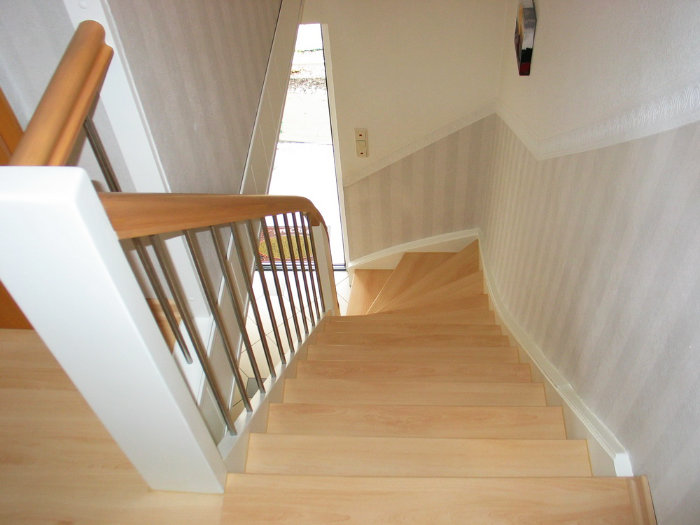 Stufen Laminat Buche, Setzstufen weiß, Handlauf natur, neue Geländerstäbe Edelstahl